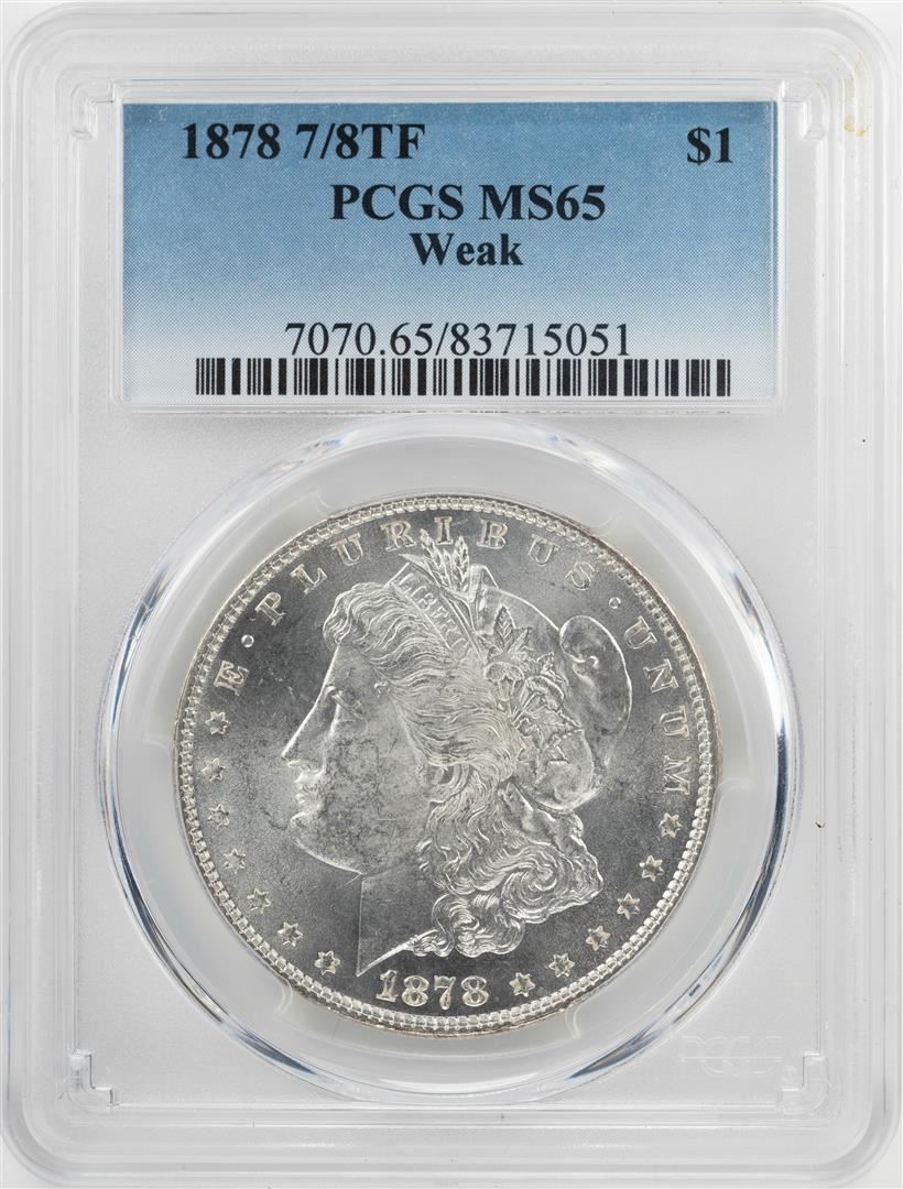 One 1878 7/8 TF $1 Morgan Silver Dollar Coin PCGS MS65. PCGS Graded.