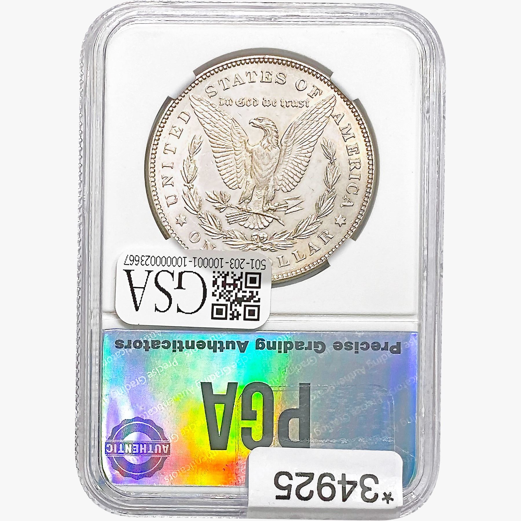 COINS AND CURRENCY LISTED IN GSA’S CATALOG AS GRADED AND ENCAPSULATED BY PCGS, NGC, ANACS, ICG, PCGS CURRENCY, PMG, PCGS BANKNOTE GRADING, CMC OR ANY OTHER THIRD-PARTY GRADING SERVICE ARE LIKEWISE SOLD “AS-IS” EXCEPT AS EXPRESSLY SET FORTH HEREIN. ALL THIRD-PARTY GRADING SERVICE GUARANTEES, INCLUDING AUTHENTICITY, ARE THE SOLE RESPONSIBILITY OF THE THIRD-PARTY GRADING SERVICE AND NOT WARRANTIES OR GUARANTEES OF GSA. BIDDERS SHOULD CONTACT THESE THIRD-PARTY GRADING SERVICES DIRECTLY WITH RESPECT TO ANY CLAIMS OR QUESTIONS THEY MAY HAVE CONCERNING THEIR GUARANTEES AND WARRANTIES. BIDDERS ACKNOWLEDGE AND AGREE THAT AUCTIONEER IS NOT BOUND BY OR LIABLE FOR ANY OPINION OR CERTIFICATION BY ANY THIRD-PARTY GRADING SERVICE. REMOVAL OF A PRODUCT FROM ITS PROTECTIVE CASING OR HOLDER OR ALTERATION OF ANY COIN HOLDER WAIVES ALL RIGHTS CONCERNING THE PRODUCT CONTAINED THEREIN.