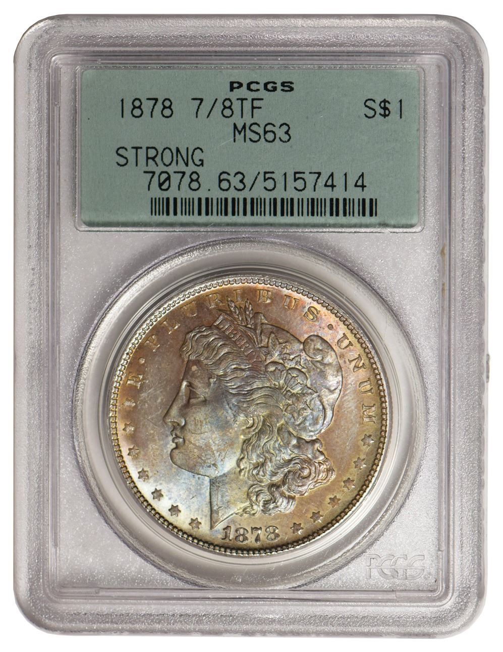 One 1878 7/8F $1 TONING Morgan Silver Dollar PCGS MS63.