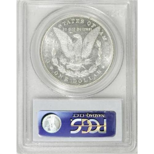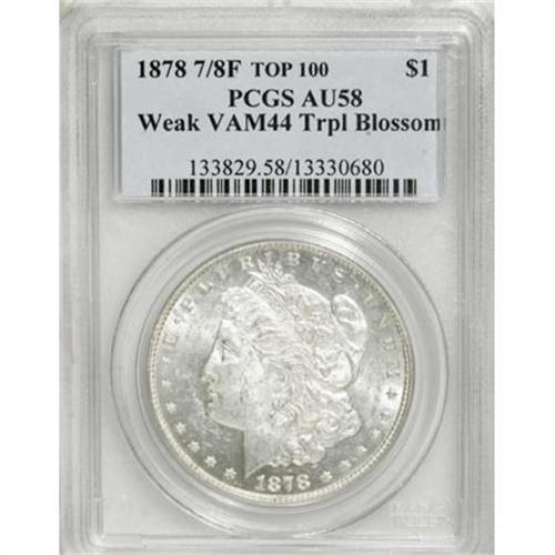 <B>1878 7/8F $1 Weak AU58 PCGS.</B></I> VAM-44A, A Top 100 Variety. This rare variety is considered to be the "King of VAMs" by many collectors. On the obverse, the leaves and cotton bolls are dramatically tripled. The reverse is the same as VAM-33, with doubled legs on the eagle and five faint extra tailfeathers. This is a brilliant example that shows semi-prooflike fields on each side. Highpoint wear is virtually nonexistent, and the grade-limiting factor seems to be the extensive, if shallow abrasions that occur on both sides. In Uncirculated grades, the VAM-44A is considered R.7, and near-Mint pieces are also quite rare. Population: 3 in 58, 3 finer (11/07). <BR><BR><b>Shipping:</b> Coins & Currency (<a target="_blank" href="http://www.heritageauctions.com/common/shipping.php">view shipping information</a>)