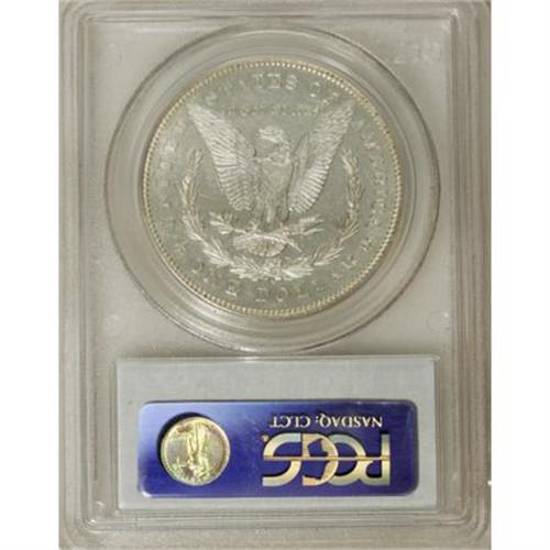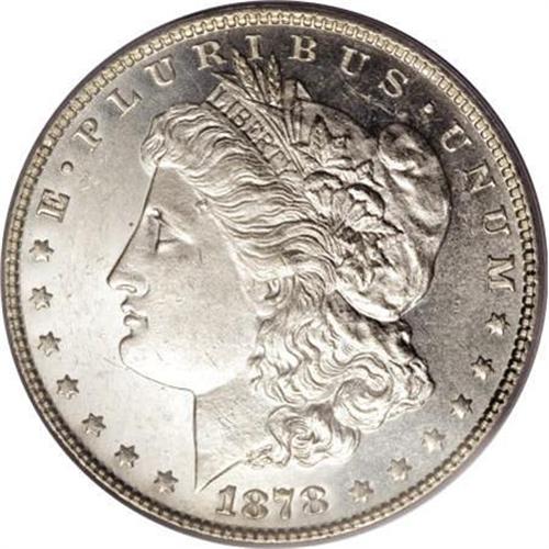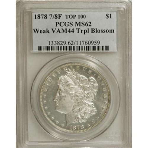 <B>1878 7/8F $1 Weak MS62 PCGS. VAM-44. Tripled Blossom.</B></I> Top 100 Variety. Considered by most VAM specialists to be the Number One Morgan dollar variety. The cotton bolls show tripled edges and blossoms. The reverse shows is the same as VAM 33 with doubled legs on the eagle and five faint extra tailfeathers. This is a brilliant, sharply struck example that shows semi-reflective fields on each side. In Uncirculated grades, the VAM-44 is considered R.7, and in MS63 it is R.8. With prooflike fields, which this piece arguably has, it is even rarer and more valuable. A rarely offered variety.<BR><BR><b>Shipping:</b> Coins & Currency (<a target="_blank" href="http://www.heritageauctions.com/common/shipping.php">view shipping information</a>\)