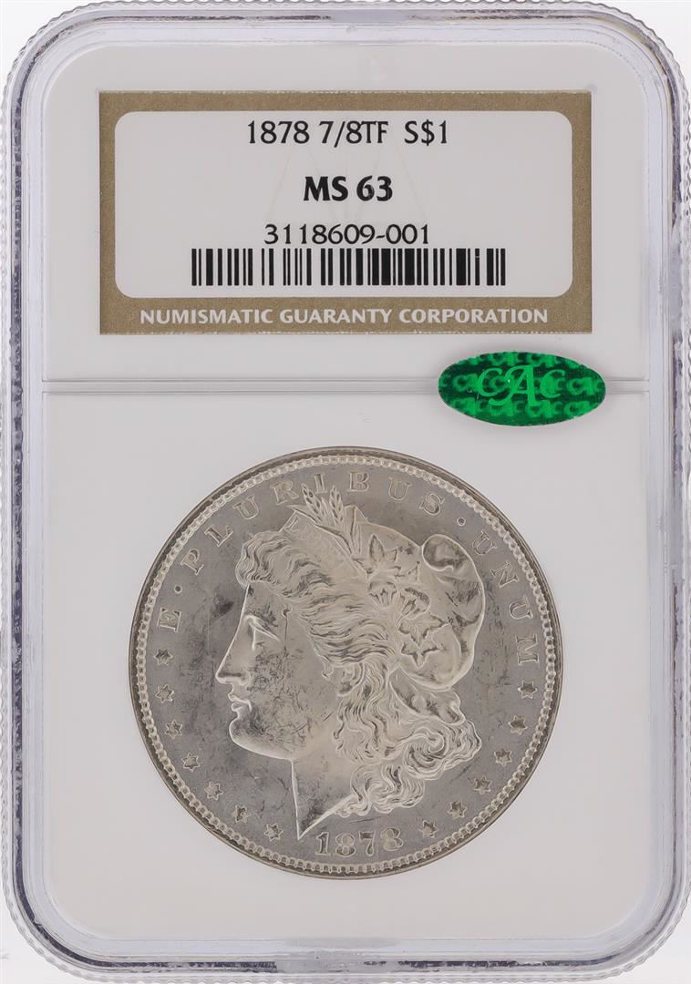 One 1878 7/8TF $1 Morgan Silver Dollar Coin NGC Graded MS63 CAC. NGC Certified.