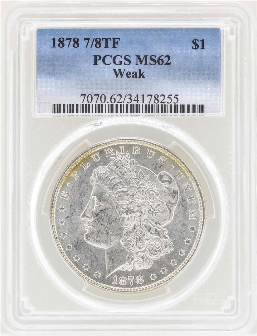 One 1878 7/8TF $1 Morgan Silver Dollar Coin PCGS MS62 Weak. PCGS Graded.