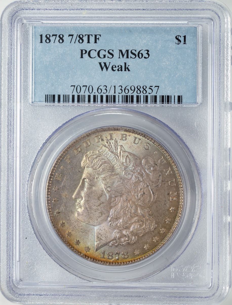 One 1878 7/8TF $1 Morgan Silver Dollar Coin PCGS MS63 Weak Nice Toning.