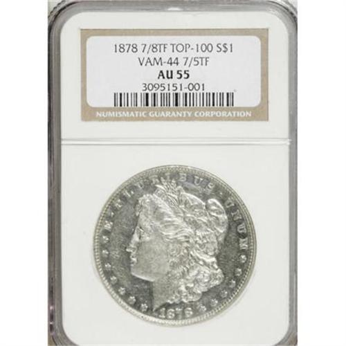<B>1878 7/8TF $1 Strong AU55 NGC.</B></I> VAM-44. A Top 100 Variety. The blossoms and leaves with Liberty's hair are die tripled, and the eagle's legs are die doubled. The key 7/8TF VAM, coveted by specialists in all grades. Flashy silver-white surfaces are minimally abraded. Well struck throughout.<BR><BR><B>Coin Engraver:</B> George T. Morgan<BR><BR><b>Shipping:</b> Coins & Currency (<a target="_blank" href="http://www.heritageauctions.com/common/shipping.php">view shipping information</a>)