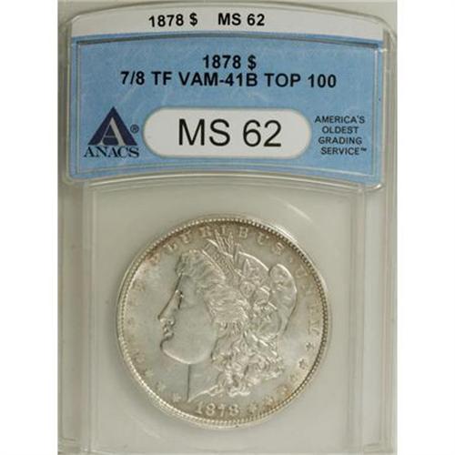 <B>1878 7/8TF $1 Strong MS62 ANACS. </B></I>VAM-41B, Top 100.<B> </B></I>NGC Census: (518/2148). PCGS Population (875/3279). Mintage: 544,000. Numismedia Wsl. Price for NGC/PCGS coin in MS62: $142. (#7078)<BR><BR><B>Coin Engraver:</B> George T. Morgan<BR><BR><b>Shipping:</b> Coins & Currency (<a target="_blank" href="http://www.heritageauctions.com/common/shipping.php">view shipping information</a>)