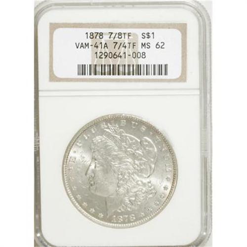 <B>1878 7/8TF $1 Strong MS62 NGC.</B></I> VAM-41A. 7/4TF. Die clash "IN" in front of Liberty's neck. NGC Census: (546/2172). PCGS Population (884/3346). Mintage: 544,000. Numismedia Wsl. Price for NGC/PCGS coin in MS62: $142. (#7078)<BR><BR><B>Coin Engraver:</B> George T. Morgan<BR><BR><b>Shipping:</b> Coins & Currency (<a target="_blank" href="http://www.heritageauctions.com/common/shipping.php">view shipping information</a>)