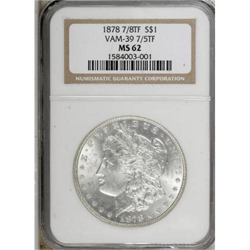 <B>1878 7/8TF $1 Strong MS62 NGC.</B></I> VAM-39 7/5TF. NGC Census: (550/2185). PCGS Population (889/3376). Mintage: 544,000. Numismedia Wsl. Price for NGC/PCGS coin in MS62: $145. (#7078)<BR><BR><B>Coin Engraver:</B> George T. Morgan<BR><BR><b>Shipping:</b> Coins & Currency (<a target="_blank" href="http://www.heritageauctions.com/common/shipping.php">view shipping information</a>)