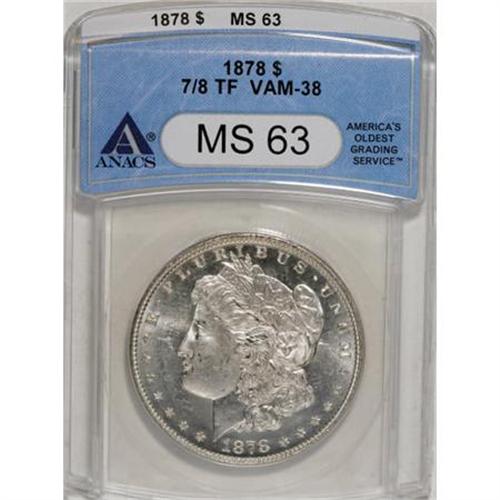 <B>1878 7/8TF $1 Strong MS63 ANACS.</B></I> VAM-38. NGC Census: (1221/964). PCGS Population (1914/1462). Mintage: 544,000. Numismedia Wsl. Price for NGC/PCGS coin in MS63: $240. (#7078)<BR><BR><B>Coin Engraver:</B> George T. Morgan<BR><BR><b>Shipping:</b> Coins & Currency (<a target="_blank" href="http://www.heritageauctions.com/common/shipping.php">view shipping information</a>)