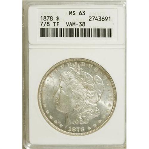 <B>1878 7/8TF $1 Strong MS63 ANACS.</B></I> VAM-38. NGC Census: (1237/971). PCGS Population (1980/1487). Mintage: 544,000. Numismedia Wsl. Price for NGC/PCGS coin in MS63: $240. (#7078)<BR><BR><B>Coin Engraver:</B> George T. Morgan<BR><BR><b>Shipping:</b> Coins & Currency (<a target="_blank" href="http://www.heritageauctions.com/common/shipping.php">view shipping information</a>)