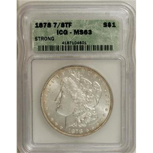 <B>1878 7/8TF $1 Strong MS63 ICG.</B></I> NGC Census: (1184/955). PCGS Population (1869/1401). Mintage: 544,000. Numismedia Wsl. Price for NGC/PCGS coin in MS63: $260. (#7078)<BR><BR><B>Coin Engraver:</B> George T. Morgan<BR><BR><b>Shipping:</b> Coins & Currency (<a target="_blank" href="http://www.heritageauctions.com/common/shipping.php">view shipping information</a>)