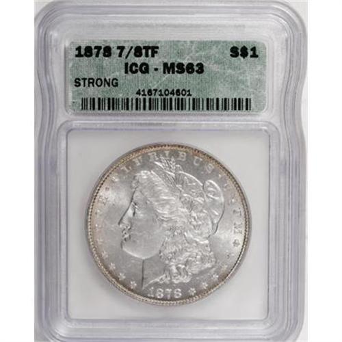 <B>1878 7/8TF $1 Strong MS63 ICG.</B></I> NGC Census: (1208/961). PCGS Population (1896/1446). Mintage: 544,000. Numismedia Wsl. Price for NGC/PCGS coin in MS63: $260. (#7078)<BR><BR><B>Coin Engraver:</B> George T. Morgan<BR><BR><b>Shipping:</b> Coins & Currency (<a target="_blank" href="http://www.heritageauctions.com/common/shipping.php">view shipping information</a>)