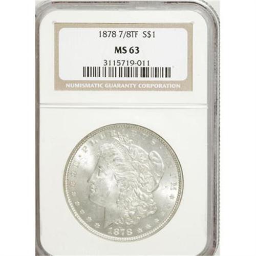 <B>1878 7/8TF $1 Strong MS63 NGC.</B></I> NGC Census: (1190/958). PCGS Population (1895/1432). Mintage: 544,000. Numismedia Wsl. Price for NGC/PCGS coin in MS63: $260. (#7078)<BR><BR><B>Coin Engraver:</B> George T. Morgan<BR><BR><b>Shipping:</b> Coins & Currency (<a target="_blank" href="http://www.heritageauctions.com/common/shipping.php">view shipping information</a>)