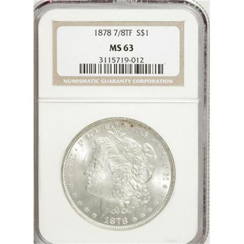 <B>1878 7/8TF $1 Strong MS63 NGC.</B></I> NGC Census: (1190/958). PCGS Population (1895/1432). Mintage: 544,000. Numismedia Wsl. Price for NGC/PCGS coin in MS63: $260. (#7078)<BR><BR><B>Coin Engraver:</B> George T. Morgan<BR><BR><b>Shipping:</b> Coins & Currency (<a target="_blank" href="http://www.heritageauctions.com/common/shipping.php">view shipping information</a>)