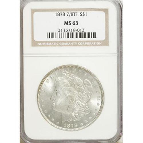 <B>1878 7/8TF $1 Strong MS63 NGC.</B></I> NGC Census: (1207/961). PCGS Population (1895/1437). Mintage: 544,000. Numismedia Wsl. Price for NGC/PCGS coin in MS63: $260. (#7078)<BR><BR><B>Coin Engraver:</B> George T. Morgan<BR><BR><b>Shipping:</b> Coins & Currency (<a target="_blank" href="http://www.heritageauctions.com/common/shipping.php">view shipping information</a>)