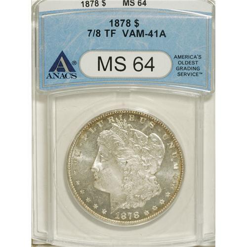 <B>1878 7/8TF $1 Strong MS64 ANACS.</B></I> NGC Census: (855/85). Mintage: 544,000. Numismedia Wsl. Price: $400. (#7078) <B>1878 7/8TF $1 Strong MS64 ANACS.</B></I> VAM-41A. NGC Census: (1702/170). PCGS Population (1203/182). Mintage: 544,000. Numismedia Wsl. Price for NGC/PCGS coin in MS64: $400. (#7070)<BR><BR><b>Shipping:</b> Coins & Currency (<a target="_blank" href="http://www.heritageauctions.com/common/shipping.php">view shipping information</a>)