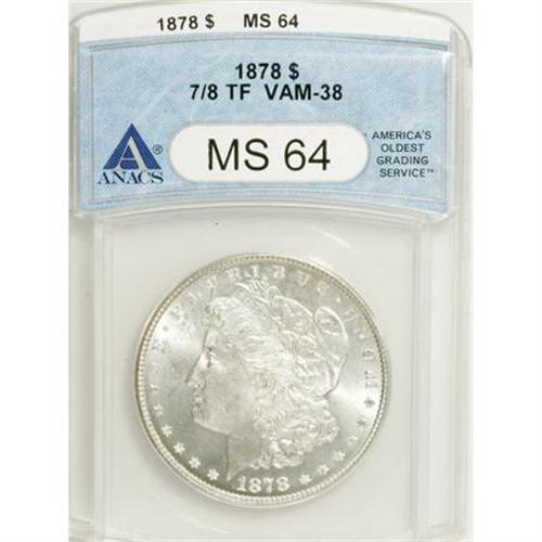 <B>1878 7/8TF $1 Strong MS64 ANACS.</B></I> VAM-38. NGC Census: (873/85). PCGS Population (1234/191). Mintage: 544,000. Numismedia Wsl. Price for NGC/PCGS coin in MS64: $400. (#7078)<BR><BR><B>Coin Engraver:</B> George T. Morgan<BR><BR><b>Shipping:</b> Coins & Currency (<a target="_blank" href="http://www.heritageauctions.com/common/shipping.php">view shipping information</a>)