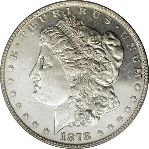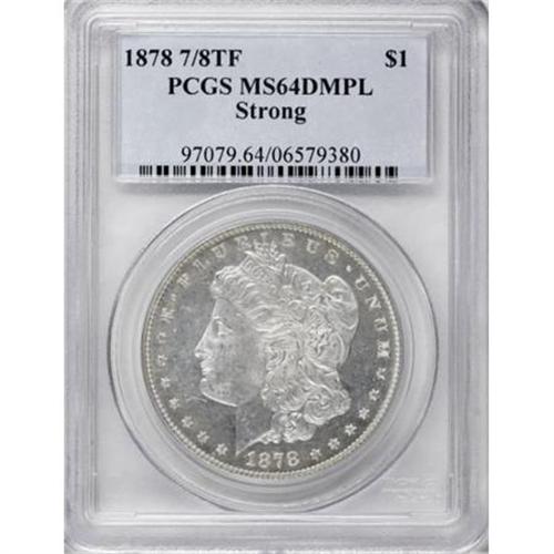 <B>1878 7/8TF $1 Strong MS64 Deep Mirror Prooflike PCGS.</B></I> VAM-38. Ample remnants of five tail feathers peer beneath the prominent seven feathers. A sharply struck and decidedly prooflike piece with untoned surfaces and a few faint luster grazes on the obverse. Population: 33 in 64 Deep Mirror Prooflike, 2 finer (12/07).<BR><BR><b>Shipping:</b> Coins & Currency (<a target="_blank" href="http://www.heritageauctions.com/common/shipping.php">view shipping information</a>)