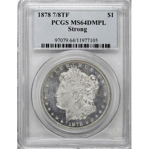 <B>1878 7/8TF $1 Strong MS64 Deep Mirror Prooflike PCGS.</B></I> VAM-37. The doubled tailfeathers on this piece are quite bold with strong tips still visible. Deeply mirrored fields establish pronounced contrast with the frosty motifs that exhibit crisp delineation. Untoned surfaces reveal just a few minor luster grazes that preclude this lovely piece from full Gem classification. Population: 29 in 64 Deep Mirror Prooflike, 2 finer (1/08).<BR><BR><b>Shipping:</b> Coins & Currency (<a target="_blank" href="http://www.heritageauctions.com/common/shipping.php">view shipping information</a>)