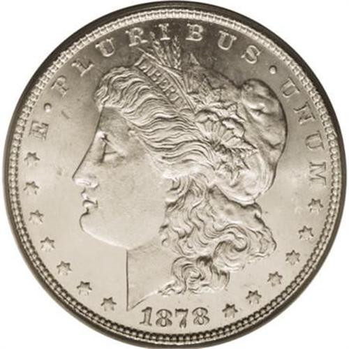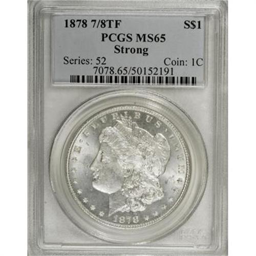 <B>1878 7/8TF $1 Strong MS65 PCGS.</B></I> Strong VAM-40 7/5. Five underfeathers show on this VAM-40 variety, attributed by the bold bottom berry on the branch held in the eagle's right (left facing) claw (photo on page 151 of the <I>Comprehensive Catalog and Encyclopedia of Morgan & Peace Dollars</B></I>, Fourth Edition). This Gem "Strong" example displays bright luster radiating from untoned surfaces, and a well executed strike impart sharp definition to the design elements, including the hair over Liberty's ear and the eagle's breast feathers. A few minor luster grazes prevent an even higher grade. The present lot is higher graded than any of the 19 examples certified as VAM-40 by PCGS.<BR><I>From The Arnold & Harriet Collection, Part Two.</B></I><BR><BR><b>Shipping:</b> Coins & Currency (<a target="_blank" href="http://www.heritageauctions.com/common/shipping.php">view shipping information</a>)