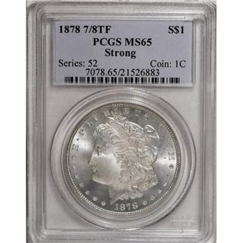 <B>1878 7/8TF $1 Strong MS65 PCGS.</B></I> VAM-37. A beautiful and essentially brilliant Gem that boasts a sharp strike and vibrant luster. Virtually immaculate aside from a few faint grazes on the cheek. Outstanding quality for this popular dual hub subtype.<BR><I>From The Jimmy G. PCGS Registry Collection of Morgan Dollars with Varieties.</B></I><BR><BR><B>Coin Engraver:</B> George T. Morgan<BR><BR><b>Shipping:</b> Coins & Currency (<a target="_blank" href="http://www.heritageauctions.com/common/shipping.php">view shipping information</a>)