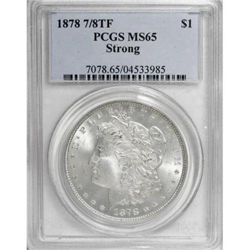 <B>1878 7/8TF $1 Strong MS65 PCGS.</B></I> VAM-37. This faintly toned and lustrous first-year Morgan dollar has four bold tailfeather fragments beneath the prominent seven tailfeathers. The strike is crisp, and the few flaws that appear on the rose-inflected surfaces are of little concern. PCGS has graded a mere five finer examples across all Strong 7/8 Tailfeathers varieties (2/08).<BR><I>From The Silver Spur Collection of Morgan Dollars.</B></I><BR><BR><B>Coin Engraver:</B> George T. Morgan<BR><BR><b>Shipping:</b> Coins & Currency (<a target="_blank" href="http://www.heritageauctions.com/common/shipping.php">view shipping information</a>)