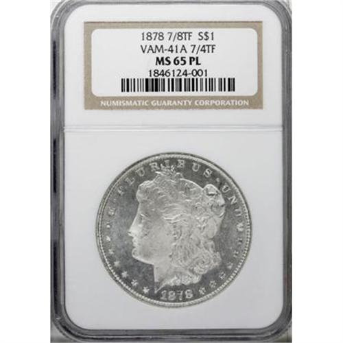 <B>1878 7/8TF $1 Strong MS65 Prooflike NGC.</B></I> VAM-41A, 7 over 4 Tailfeathers. Four distinct tailfeathers show just under the 7 normal feathers. This variety supersedes the popular VAM-41 (which exhibits 7 clear underfeathers), caused by die polishing that obliterated some of the detail. Interestingly enough, this example is clearly prooflike and might have been one of the first struck of the VAM-41A type. Brilliant overall; a couple of minor marks are noted on the obverse.<BR><BR><B>Coin Engraver:</B> George T. Morgan<BR><BR><b>Shipping:</b> Coins & Currency (<a target="_blank" href="http://www.heritageauctions.com/common/shipping.php">view shipping information</a>)