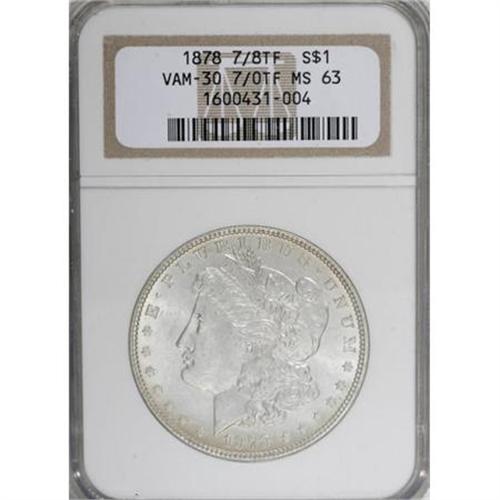<B>1878 7/8TF $1 Weak MS63 NGC.</B></I> VAM-30. 7/0TF. NGC Census: (0/0). PCGS Population (940/823). Mintage: 544,000. (#7070)<BR><BR><B>Coin Engraver:</B> George T. Morgan<BR><BR><b>Shipping:</b> Coins & Currency (<a target="_blank" href="http://www.heritageauctions.com/common/shipping.php">view shipping information</a>)