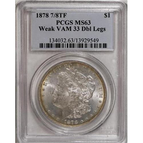 <B>1878 7/8TF $1 Weak, Double Legs MS63 PCGS.</B></I> Vam-33. PCGS Population (30/47). NGC Census: (0/0). (#134032)<BR><BR><b>Shipping:</b> Coins & Currency (<a target="_blank" href="http://www.heritageauctions.com/common/shipping.php">view shipping information</a>)