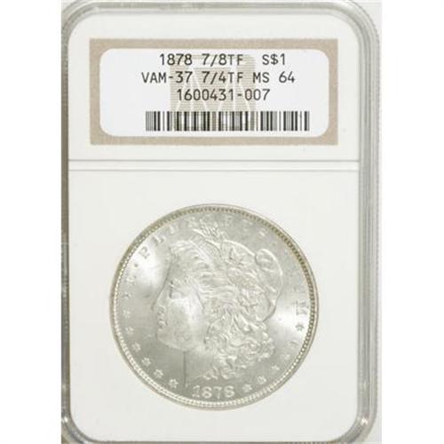 <B>1878 7/8TF $1 Weak MS64 NGC.</B></I> VAM-37. 7/4TF. NGC Census: (0/0). PCGS Population (699/124). Mintage: 544,000. (#7070)<BR><BR><B>Coin Engraver:</B> George T. Morgan<BR><BR><b>Shipping:</b> Coins & Currency (<a target="_blank" href="http://www.heritageauctions.com/common/shipping.php">view shipping information</a>)