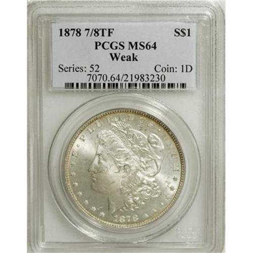 <B>1878 7/8TF $1 Weak MS64 PCGS.</B></I> PCGS Population (708/119). NGC Census: (0/0). Mintage: 544,000. (#7070)<BR><BR><B>Coin Engraver:</B> George T. Morgan<BR><BR><b>Shipping:</b> Coins & Currency (<a target="_blank" href="http://www.heritageauctions.com/common/shipping.php">view shipping information</a>)