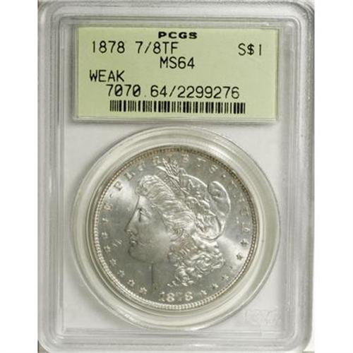<B>1878 7/8TF $1 Weak MS64 PCGS.</B></I> PCGS Population (695/126). NGC Census: (0/0). Mintage: 544,000. (#7070)<BR><BR><B>Coin Engraver:</B> George T. Morgan<BR><BR><b>Shipping:</b> Coins & Currency (<a target="_blank" href="http://www.heritageauctions.com/common/shipping.php">view shipping information</a>)