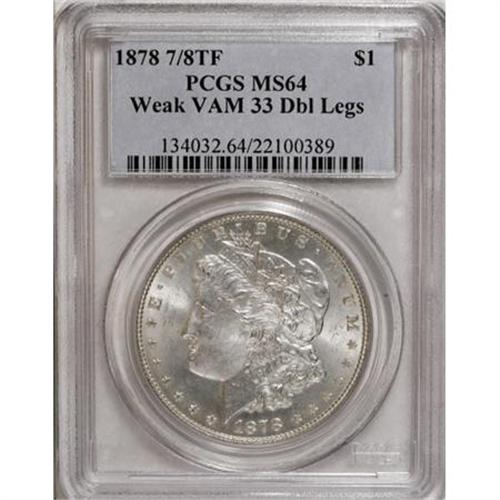 <B>1878 7/8TF $1 Weak Double Legs MS64 PCGS.</B></I> Vam 33. PCGS Population (40/7). NGC Census: (0/0). (#134032)<BR><BR><b>Shipping:</b> Coins & Currency (<a target="_blank" href="http://www.heritageauctions.com/common/shipping.php">view shipping information</a>)
