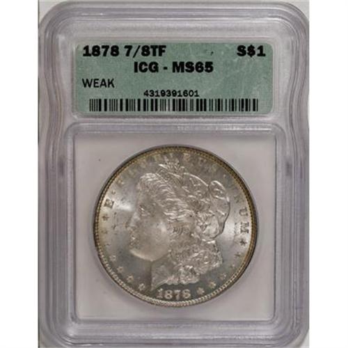 <B>1878 7/8TF $1 Weak MS65 ICG.</B></I> . NGC Census: (0/0). PCGS Population (118/7). Mintage: 544,000. (#7070)<BR><BR><B>Coin Engraver:</B> George T. Morgan<BR><BR><b>Shipping:</b> Coins & Currency (<a target="_blank" href="http://www.heritageauctions.com/common/shipping.php">view shipping information</a>)