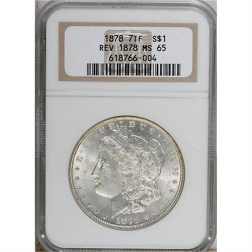 <B>1878 7/8TF $1 Weak MS65 NGC.</B></I> VAM-33. Designated only as a 7TF Reverse of 1878 by NGC. The right reverse border is powder-blue and golden-brown, while the remainder of this lustrous Gem is brilliant. Well struck and thoroughly attractive.<BR><BR><B>Coin Engraver:</B> George T. Morgan<BR><BR><b>Shipping:</b> Coins & Currency (<a target="_blank" href="http://www.heritageauctions.com/common/shipping.php">view shipping information</a>)