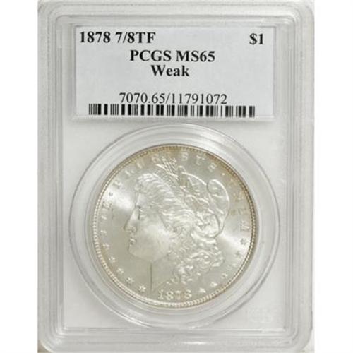 <B>1878 7/8TF $1 Weak MS65 PCGS.</B></I> VAM-33. This boldly struck Gem offers vibrant luster and delicate tawny-gold toning. The reverse is particularly well preserved. Interesting clash marks are present near Liberty's mouth.<BR><BR><B>Coin Engraver:</B> George T. Morgan<BR><BR><b>Shipping:</b> Coins & Currency (<a target="_blank" href="http://www.heritageauctions.com/common/shipping.php">view shipping information</a>\)