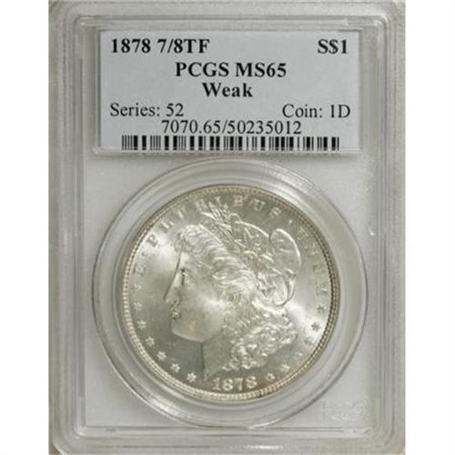 <B>1878 7/8TF $1 Weak MS65 PCGS.</B></I> VAM-33. The "Weak" designation means that this piece has doubled tailfeathers, but so few that they are extremely difficult to see. Obviously, it is less desirable than the "Strong" pieces, but it is still more desirable than the normal 7 or 8 tailfeather pieces. Brilliant and lustrous with excellent surfaces.<BR><BR><B>Coin Engraver:</B> George T. Morgan<BR><BR><b>Shipping:</b> Coins & Currency (<a target="_blank" href="http://www.heritageauctions.com/common/shipping.php">view shipping information</a>)