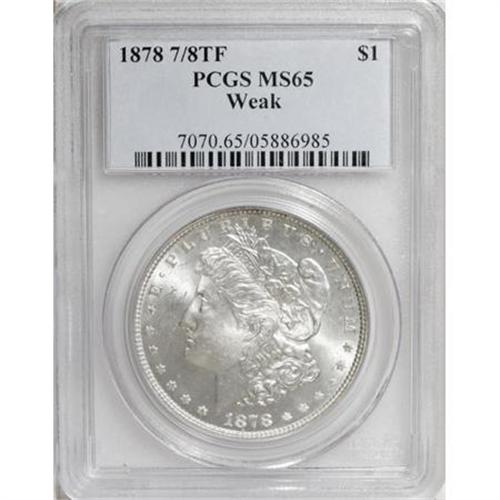 <B>1878 7/8TF $1 Weak MS65 PCGS.</B></I> VAM-33. Parts of three underfeathers show on the eagle's tail. Sharply struck, including the hair at Liberty's ear and the eagle's breast feathers. Well preserved lustrous surfaces are essentially untoned. PCGS has seen only seven coins finer.<BR><I>From The Silver Spur Collection of Morgan Dollars.</B></I><BR><BR><B>Coin Engraver:</B> George T. Morgan<BR><BR><b>Shipping:</b> Coins & Currency (<a target="_blank" href="http://www.heritageauctions.com/common/shipping.php">view shipping information</a>)