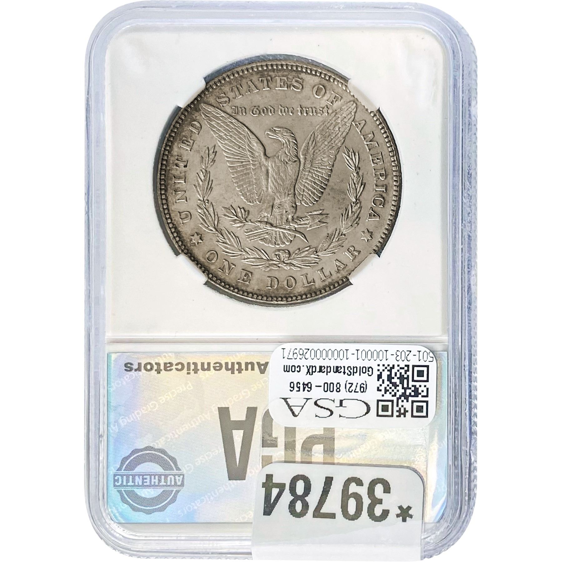 COINS AND CURRENCY LISTED IN GSA’S CATALOG AS GRADED AND ENCAPSULATED BY PCGS, NGC, ANACS, ICG, PCGS CURRENCY, PMG, PCGS BANKNOTE GRADING, CMC OR ANY OTHER THIRD-PARTY GRADING SERVICE ARE LIKEWISE SOLD “AS-IS” EXCEPT AS EXPRESSLY SET FORTH HEREIN. ALL THIRD-PARTY GRADING SERVICE GUARANTEES, INCLUDING AUTHENTICITY, ARE THE SOLE RESPONSIBILITY OF THE THIRD-PARTY GRADING SERVICE AND NOT WARRANTIES OR GUARANTEES OF GSA. BIDDERS SHOULD CONTACT THESE THIRD-PARTY GRADING SERVICES DIRECTLY WITH RESPECT TO ANY CLAIMS OR QUESTIONS THEY MAY HAVE CONCERNING THEIR GUARANTEES AND WARRANTIES. BIDDERS ACKNOWLEDGE AND AGREE THAT AUCTIONEER IS NOT BOUND BY OR LIABLE FOR ANY OPINION OR CERTIFICATION BY ANY THIRD-PARTY GRADING SERVICE. REMOVAL OF A PRODUCT FROM ITS PROTECTIVE CASING OR HOLDER OR ALTERATION OF ANY COIN HOLDER WAIVES ALL RIGHTS CONCERNING THE PRODUCT CONTAINED THEREIN.