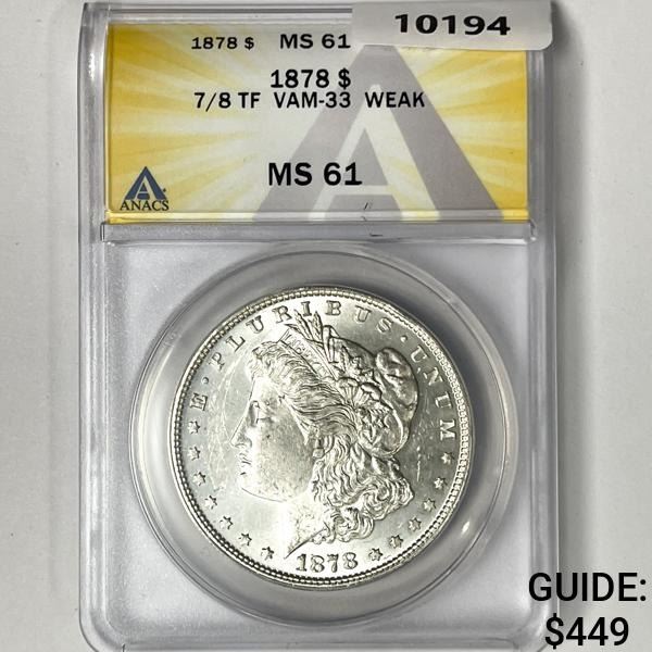 1878 7/8TF Morgan Silver Dollar ANACS-MS61 VAM-SS