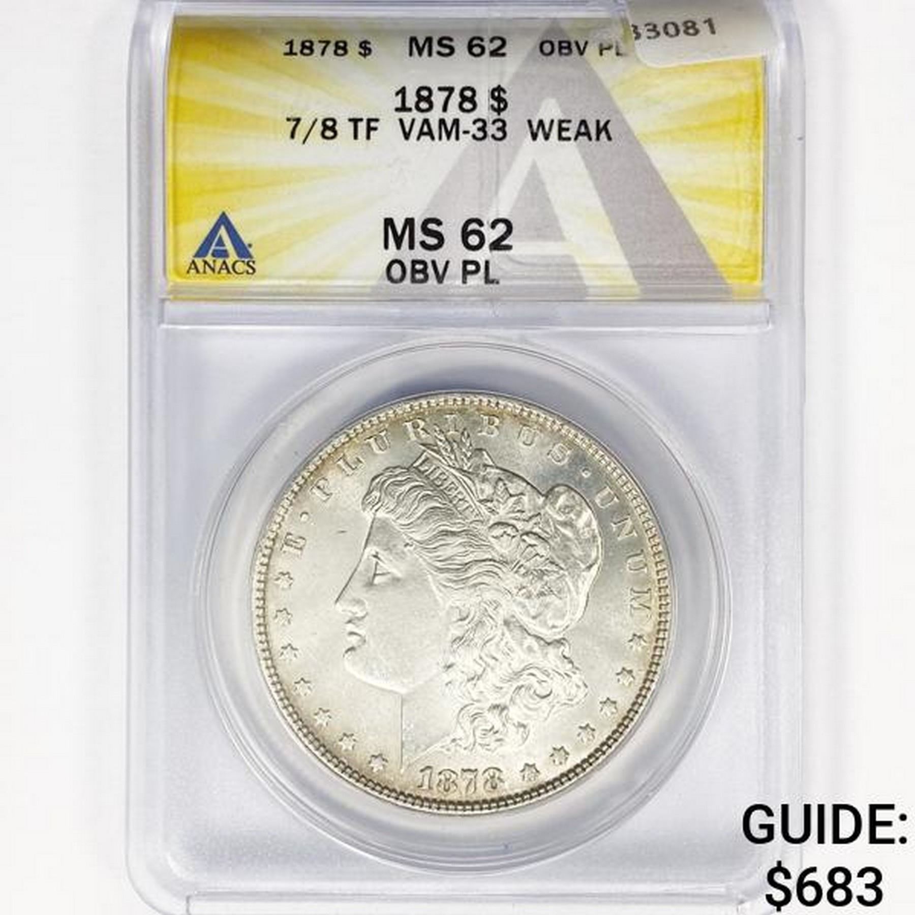 1878 7/8TF Morgan Silver Dollar ANACS MS62 VAM-33 OBV PL