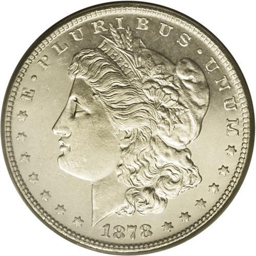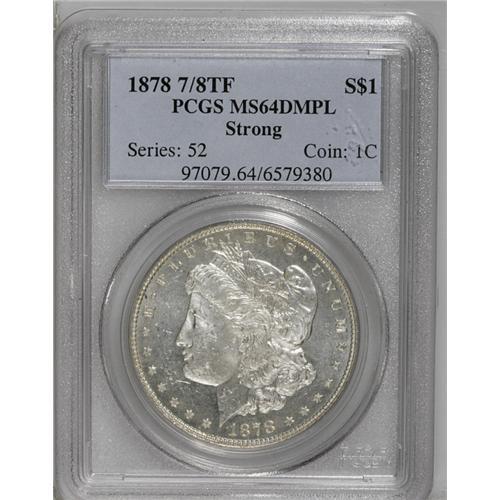 <B>1878 7/8TF<img border='0' src='http://www.heritagecoins.com/images/star.gif' width=10 height=10>$1> Strong MS64 Deep Mirror Prooflike PCGS.</B></I> Ample remnants of five tail feathers peer beneath the prominent seven feathers. A sharply struck and decidedly prooflike piece with untoned surfaces and a few faint luster grazes on the obverse. Population: 29 in 64, 2 finer (7/06).<BR><I>From The New York Eye Appeal Collection.</B></I>