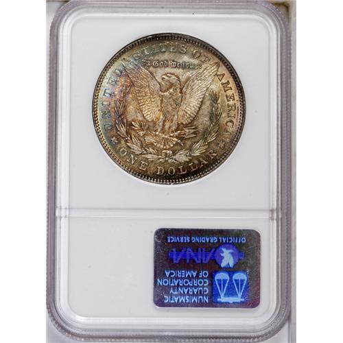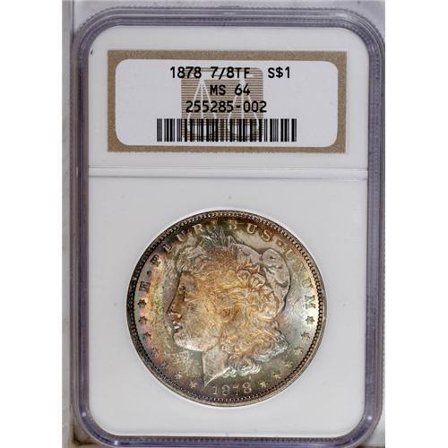 <B>1878 7/8TF<img border='0' src='http://www.heritagecoins.com/images/star.gif' width=10 height=10>$1> Strong MS64 NGC.</B></I> VAM-36. Lustrous and well struck, this piece is toned in attractive red, orange, and blue. Abrasions on Liberty's cheek and the eagle's breast limit the grade.