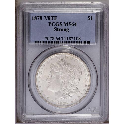 <B>1878 7/8TF<img border='0' src='http://www.heritagecoins.com/images/star.gif' width=10 height=10>$1> Strong MS64 PCGS.</B></I> A satiny near-Gem example with brilliant silver surfaces. There is no evidence of toning on either side of this bright white Morgan dollar. Tips of five feathers are visible beneath the eagle's tail. <BR><BR><B>Important notice:</B> Heritage usually auctions material at the rate of 200-250 lots per hour. On some occasions eBay Live bid software or the Internet may not be able to keep up with the pace of the auction. We recommend placing a realistic absentee bid now as insurance to avoid disappointment. Occasionally the auctioneer may eliminate or reject an eBay Live bid, and the auctioneer may also reopen a lot after the close of the eBay live bidding (usually because we missed an audience bid), and may reject your bid even if it shows you as the winning bidder. By bidding via eBay Live, you agree that Heritage may award the lot to another bidder at its sole discretion under the circumstances described above or any other reasonable circumstances. Since eBay bids are not shown to us until we open the lot on the floor, we treat those bids just like floor bids. In most cases the floor responds before the eBay bid is presented to us, due to Internet lag time, so for consistency we have made it a policy that floor bids are always considered first over tie eBay live bids. Also please note that all Heritage lots purchased through eBay Live carry a 20% Buyer's Premium. Please make sure you read the Terms and Conditions before you bid. This lot is being auctioned in conjunction with a live floor auction by Heritage Galleries & Auctioneers. All final auction and invoice information will be supplied by Heritage Galleries & Auctioneers, and all other information should be considered preliminary. Lot:3186 <BR><BR><B>Winning Notification and Billing:</B> After the FINAL session in this auction is complete, Heritage will send e-mail and snail mail invoices. This process normally takes several days. All final auction and invoice information will be supplied by Heritage Galleries & Auctioneers, and all other information should be considered preliminary. <BR><BR>This auction will be conducted on a live auction floor and over the Internet through eBay Live. If you choose to place an absentee bid, please take a moment to <font color='#0000ff'><u><a href='http://pages.ebay.com/liveauctions/help/before/laabsentee.html'>learn how eBay Live absentee bidding works</a></u></font><font color='#000000'>