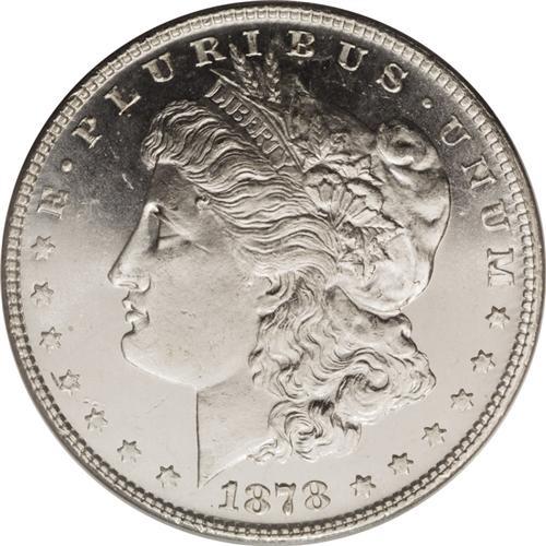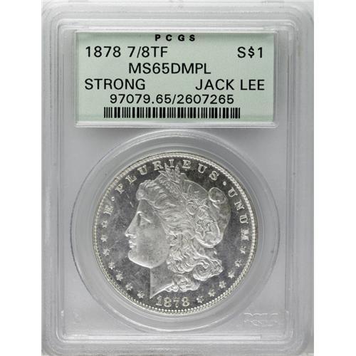 <B>1878 7/8TF S$1 Strong MS65 Deep Mirror Prooflike PCGS.</B></I> Ex: Jack Lee. VAM-38. This strongly doubled version of the "7 over 8" tail feathers issue shows tips of five feathers beneath the prominent seven tailfeathers. A fully brilliant Gem with attractively mirrored fields and lustrous silver devices that provide noticeable cameo contrast. Examples of this issue are sometimes encountered with prooflike reflectivity on one side or the other, but rarely with both sides exhibiting mirrored fields, and almost never with deeply mirrored fields on both sides. In fact, this example is one of just two coins to receive a Gem MS65 DMPL grade by PCGS, with none finer. Certified in a green label holder. Population: 2 in 65 Deep Mirror Prooflike, none finer (11/06).<BR><BR><b>Shipping:</b> Coin/Currency (<a target="_blank" href="http://www.heritageauctions.com/common/shipping.php">view shipping information</a>)