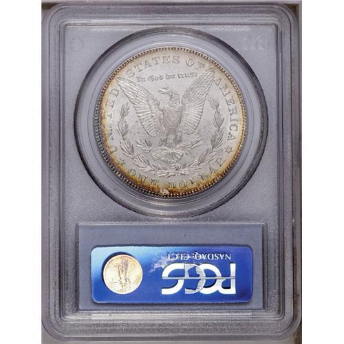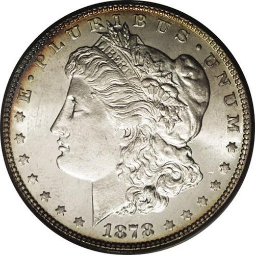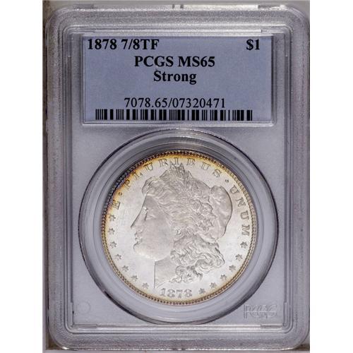 <B>1878 7/8TF<img border='0' src='http://www.heritagecoins.com/images/star.gif' width=10 height=10>$1> Strong MS65 PCGS.</B></I> A pleasing Gem of this important and sought-after variety. Highly lustrous surfaces are visited by whispers of gold peripheral toning on both sides, which is joined by cobalt-blue and lavender on the reverse margins. The design elements are well brought up, and just a few minute marks are noted on generally well preserved surfaces. Only four pieces grading finer have been seen by PCGS (3/06). <BR><BR><B>Important notice:</B> Heritage usually auctions material at the rate of 200-250 lots per hour. On some occasions eBay Live bid software or the Internet may not be able to keep up with the pace of the auction. We recommend placing a realistic absentee bid now as insurance to avoid disappointment. Occasionally the auctioneer may eliminate or reject an eBay Live bid, and the auctioneer may also reopen a lot after the close of the eBay live bidding (usually because we missed an audience bid), and may reject your bid even if it shows you as the winning bidder. By bidding via eBay Live, you agree that Heritage may award the lot to another bidder at its sole discretion under the circumstances described above or any other reasonable circumstances. Since eBay bids are not shown to us until we open the lot on the floor, we treat those bids just like floor bids. In most cases the floor responds before the eBay bid is presented to us, due to Internet lag time, so for consistency we have made it a policy that floor bids are always considered first over tie eBay live bids. Also please note that all Heritage lots purchased through eBay Live carry a 20% Buyer's Premium. Please make sure you read the Terms and Conditions before you bid. This lot is being auctioned in conjunction with a live floor auction by Heritage Galleries & Auctioneers. All final auction and invoice information will be supplied by Heritage Galleries & Auctioneers, and all other information should be considered preliminary. Lot:3187 <BR><BR><B>Winning Notification and Billing:</B> After the FINAL session in this auction is complete, Heritage will send e-mail and snail mail invoices. This process normally takes several days. All final auction and invoice information will be supplied by Heritage Galleries & Auctioneers, and all other information should be considered preliminary. <BR><BR>This auction will be conducted on a live auction floor and over the Internet through eBay Live. If you choose to place an absentee bid, please take a moment to <font color='#0000ff'><u><a href='http://pages.ebay.com/liveauctions/help/before/laabsentee.html'>learn how eBay Live absentee bidding works</a></u></font><font color='#000000'>