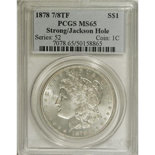 <B>1878 7/8TF S$1 Strong MS65 PCGS.</B></I> Ex: Jackson Hole. VAM-41. A Top 100 Variety. According to the <I>Top 100</B></I> reference, "This VAM shows the most complete doubling of the eagle's tailfeathers of any so-called 7/8 TF variety." Brilliant and boldly struck with satin luster and a clean cheek.<BR><I>From The Jackson Hole Collection.</B></I><BR><BR><b>Shipping:</b> Coins & Currency (<a target="_blank" href="http://www.heritageauctions.com/common/shipping.php">view shipping information</a>)