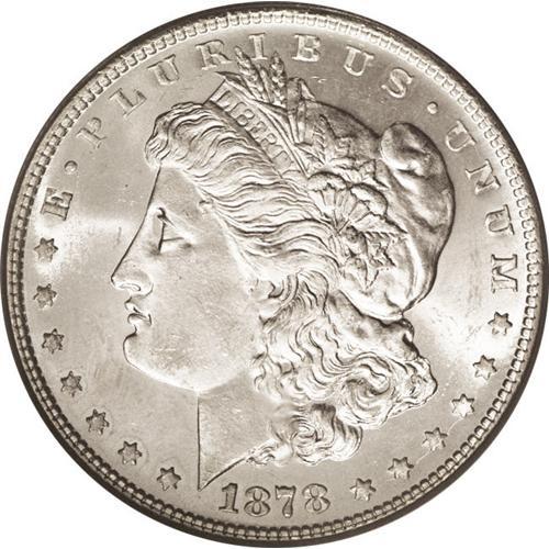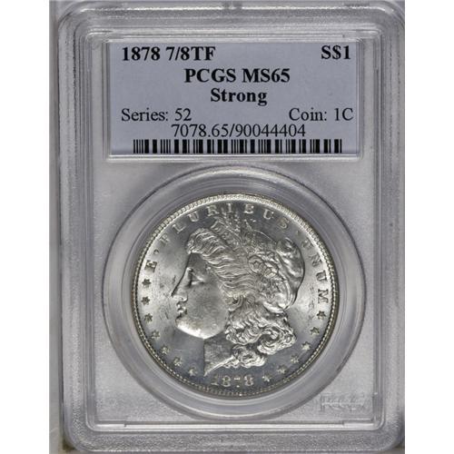 <B>1878 7/8TF<img border='0' src='http://www.heritagecoins.com/images/star.gif' width=10 height=10>$1> Strong MS65 PCGS.</B></I> Vibrant luster exudes from bright, silver surfaces, and sharp detail extends throughout the design elements, including good definition in the hair overlying Liberty's ear. Light scuffs on the cheek and in the obverse fields do not in the least deny the Gem designation. Difficult to locate finer.<BR><I>From The Chicago-Ark Collection.</B></I>