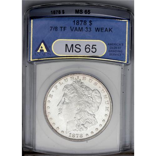 <B>1878 7/8TF<img border='0' src='http://www.heritagecoins.com/images/star.gif' width=10 height=10>$1> Weak MS65 ANACS.</B></I> VAM-33. Booming luster bathes this meticulously struck, nearly brilliant, and carefully preserved Gem. Traces of four extra tail feathers are present. <BR><BR><B>Important notice:</B> Heritage usually auctions material at the rate of 200-250 lots per hour. On some occasions eBay Live bid software or the Internet may not be able to keep up with the pace of the auction. We recommend placing a realistic absentee bid now as insurance to avoid disappointment. Occasionally the auctioneer may eliminate or reject an eBay Live bid, and the auctioneer may also reopen a lot after the close of the eBay live bidding (usually because we missed an audience bid), and may reject your bid even if it shows you as the winning bidder. By bidding via eBay Live, you agree that Heritage may award the lot to another bidder at its sole discretion under the circumstances described above or any other reasonable circumstances. Since eBay bids are not shown to us until we open the lot on the floor, we treat those bids just like floor bids. In most cases the floor responds before the eBay bid is presented to us, due to Internet lag time, so for consistency we have made it a policy that floor bids are always considered first over tie eBay live bids. Also please note that all Heritage lots purchased through eBay Live carry a 20% Buyer's Premium. Please make sure you read the Terms and Conditions before you bid. This lot is being auctioned in conjunction with a live floor auction by Heritage Galleries & Auctioneers. All final auction and invoice information will be supplied by Heritage Galleries & Auctioneers, and all other information should be considered preliminary. Lot:3190 <BR><BR><B>Winning Notification and Billing:</B> After the FINAL session in this auction is complete, Heritage will send e-mail and snail mail invoices. This process normally takes several days. All final auction and invoice information will be supplied by Heritage Galleries & Auctioneers, and all other information should be considered preliminary. <BR><BR>This auction will be conducted on a live auction floor and over the Internet through eBay Live. If you choose to place an absentee bid, please take a moment to <font color='#0000ff'><u><a href='http://pages.ebay.com/liveauctions/help/before/laabsentee.html'>learn how eBay Live absentee bidding works</a></u></font><font color='#000000'>