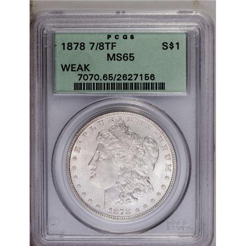 <B>1878 7/8TF<img border='0' src='http://www.heritagecoins.com/images/star.gif' width=10 height=10>$1> Weak MS65 PCGS.</B></I> Brilliant-white and fully struck with a few light luster grazes that keep this pleasing example from an even higher category.
